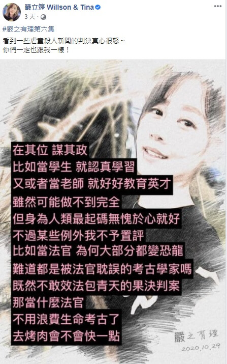 嚴立婷29日在臉書發文貼出照片並在貼文內容中寫下,「看到一些虐童殺人新聞的判決真心很怒~你們一定也跟我一樣!」從照片中可以看到,嚴立婷引用了論語中的某一句話,「在其位,謀其政!」她認為「當學生就認真學習,或者當老師,就好好教育英才,雖然可能做不到完全,但身為人類起碼問心無愧就好!」
