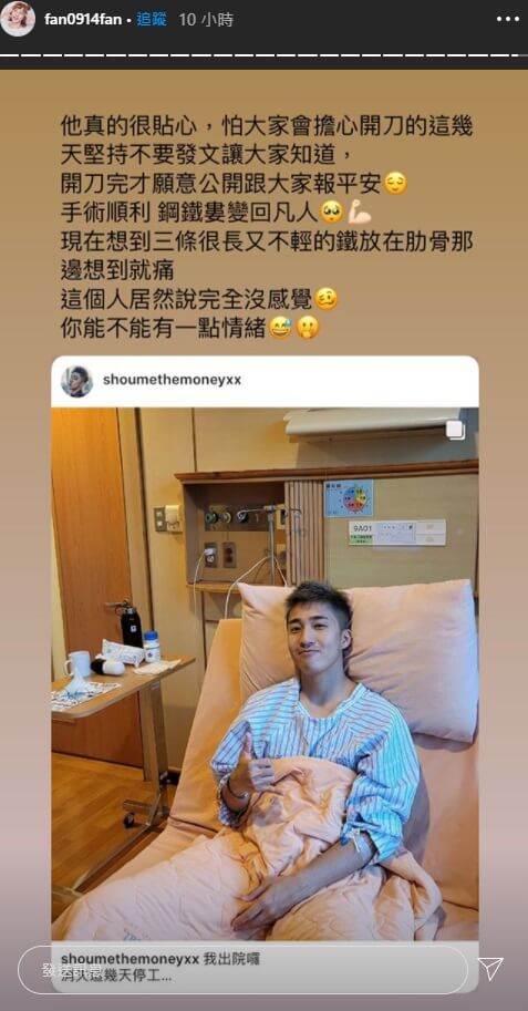 從照片中可以看到,他除了曬出手術成功的照片,還貼出自己還沒拿出鐵條的X光照,以及術後手上拿著3根鐵條的照片,讓不少人看到都非常震驚!而身為婁峻碩女友的焦凡凡,看到男友的發文之後也轉發貼文並在限時動態中寫下,「他真的很貼心,怕大家會擔心,開刀的這幾天堅持不要發文讓大家知道,開刀完才願意公開跟大家報平安~」焦凡凡還說,「想到三條很長又不輕的鐵放在肋骨那邊就好痛,這個人居然說完全沒感覺,你能不能有一點情緒?」