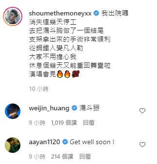 婁峻碩最近在IG上發文曬出自己坐在病床上的照片,並在貼文內容中寫道,「我出院囉!消失這幾天停工,去把漏斗胸做了一個結尾,支架拿出來的手術非常順利!」甚至還自嘲說,「從鋼鐵人變凡人勒~大家不用擔心我,休息個幾天又能重回舞臺啦!演唱會見」。