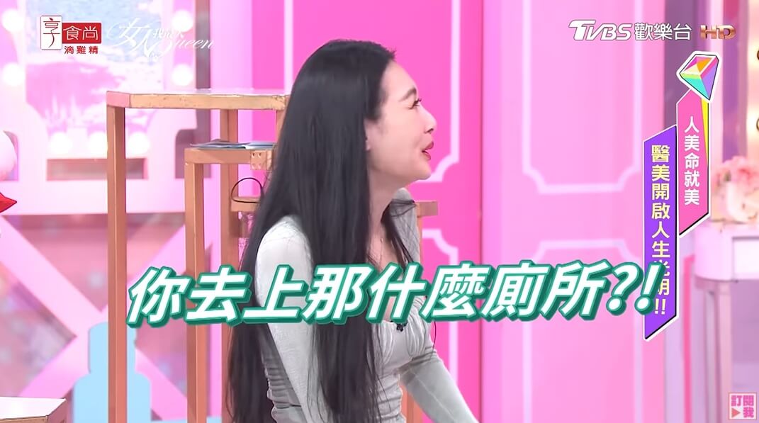 薔薔最近在《女人我最大》的節目中大方分享自己的醫美經驗,她提到自己某次去上個廁所,沒想到在門關上之後,發現了廁所裡面貼著如何讓私密處變緊緻的廣告,而且還清楚的展示出手術前、手術後的差別有多大,讓薔薔頓時對這項醫美療程相當感興趣!結果好姊妹王思佳聽了很傻眼,在旁邊直呼,「上那什麼廁所,我怎麼都沒看過?」
