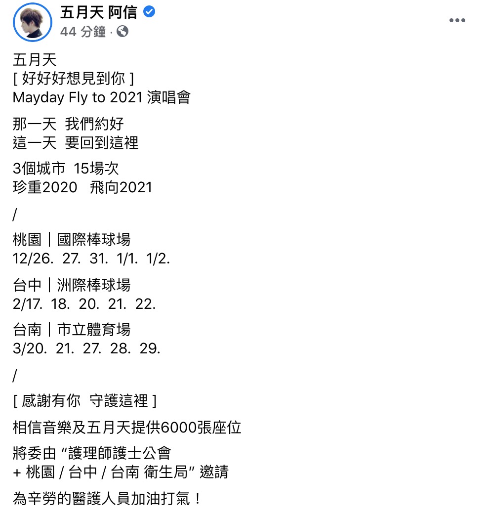快訊/五月天宣布「跨年開唱」!15場次資訊曝光 暖心留6千座位給醫護人員
