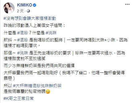 KIMIKO先前在限時動態發文提到自己會跟老公一起喝「混珍洗珠」的珍奶,沒想到「洗珠」這個詞竟引起網友們熱烈討論,讓她趕緊又發文解釋說,她喝珍奶堅持一定要「混珍」,一定要同時喝到大珍珠+小珍珠,才有層次感!