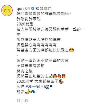 此外,峮峮也透露自己都有收到大家給她的打氣,「感謝一直以來不離不棄的大家,不管未來有多難,哭完之後,仍然要正能量的走起!2020球季,大家都辛苦了!」可以感受到她現在也漸漸走出傷痛,努力讓自己振作。