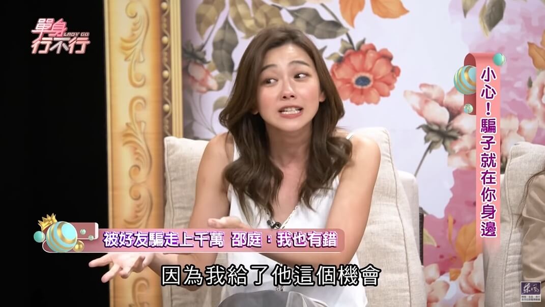 邵庭最近上《單身行不行》節目,大方提到自己曾經被好朋友欺騙千萬的事,她表示自己沒有經紀人,所以所有的事情都是自己處理,忙到身邊的朋友都勸她開一間公司或是工作室,後來有一位認識10年以上的好友主動跟她說,「我有兩間公司,有一間我沒有在用,為了你去申請演藝工作項目,這樣就也可以開發票,公司會計師也可以用」。