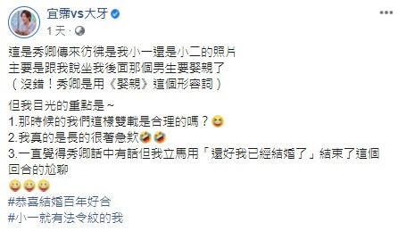 後來她也覺得媽媽似乎是話中有話,不過機智的大牙馬上用一句「還好我已經結婚了」來結束這個話題,讓媽媽不會再跟她尬聊下去XD而大牙也在貼文最後加上Hashtag「#恭喜結婚百年好合 #小一就有法令紋的我」,引起網友熱烈討論。