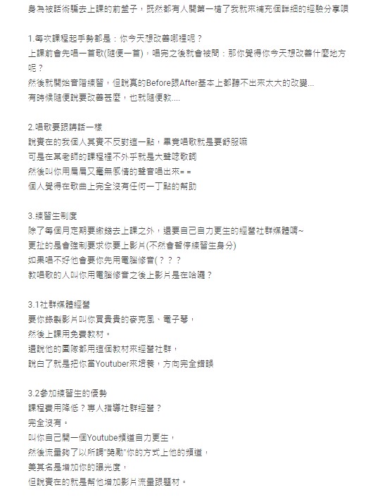 另外,關於陪練這件事情,我這邊指的並不是我沒有耐心,不願意陪學生練習我在課程當中,一定會確保學生已經抓到練習的唱法,並聽得出前後聲音的差異,剩下的只是需要花時間鍛鍊熟悉,因為課後反覆的練習是非常重要的,而在回去練習的這段時間,有遇到任何問題,學生們也都可以跟我們反應 ,我們也會回覆並給予協助。