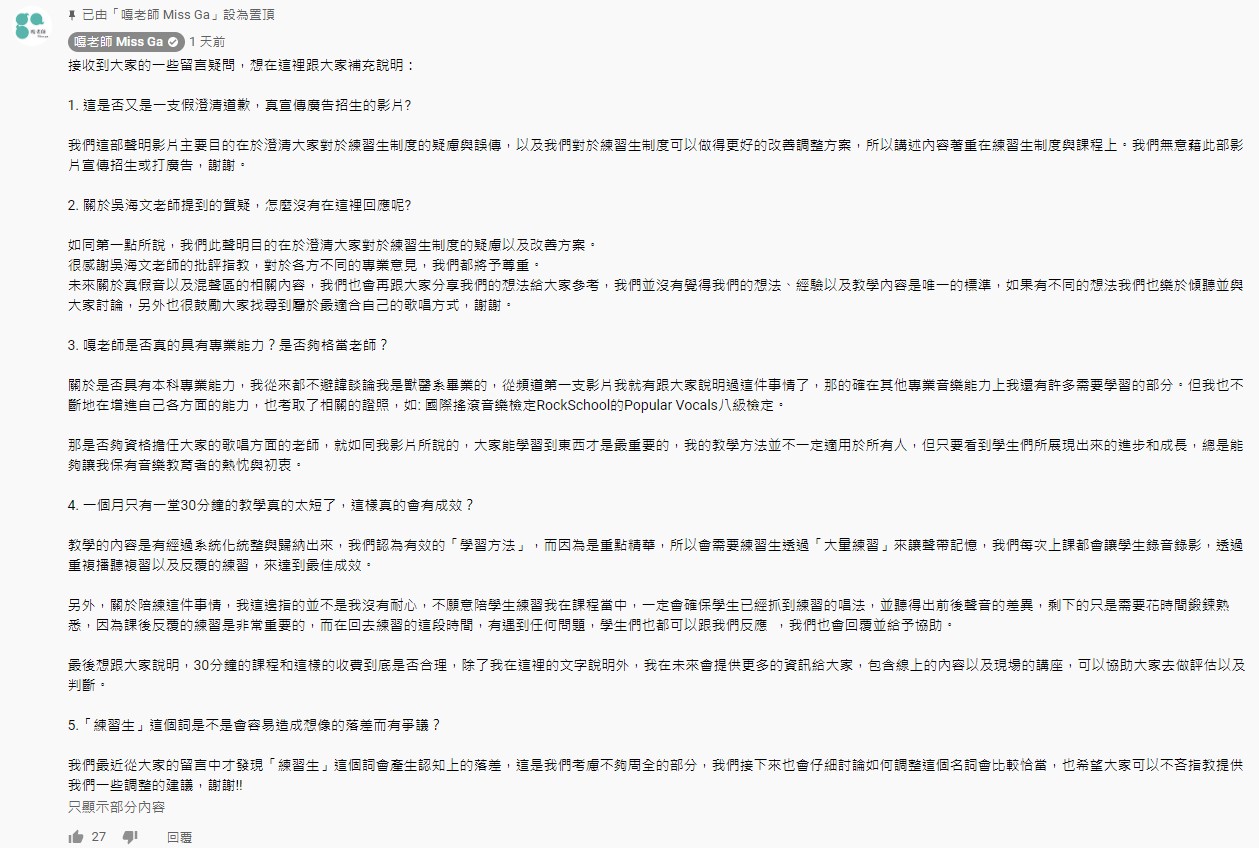 我們這部聲明影片主要目的在於澄清大家對於練習生制度的疑慮與誤傳,以及我們對於練習生制度可以做得更好的改善調整方案,所以講述內容著重在練習生制度與課程上。我們無意藉此部影片宣傳招生或打廣告,謝謝。