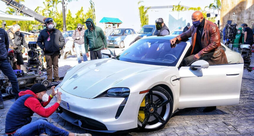 巨石強森所主演的Netflix電影《紅色通緝令》(Red Notice)才剛結束拍攝工作,他最近也在IG分享花絮照,並且提到有一場戲是他要開著保時捷上演追逐戰,劇組特地花了高額的成本,經過好幾個月才將這台昂貴的車搬到片場,只是沒想到擁有196公分、117公斤體型的巨石強森,整個人實在是太大隻......寬闊的「後背」讓他完全進不去座位,尷尬的窘境讓不少現場的劇組人員看了傻眼到笑出來,最後只能採取其它的方式來拍攝。
