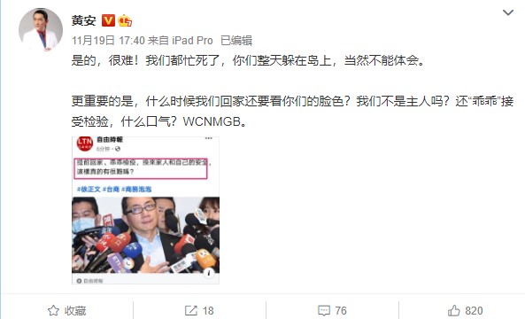 被視為「舔共藝人」的黃安近期在微博上發布一則貼文,內容表示對台政府政策的不滿。他附上一張新聞截圖,內容表示希望台商能提早回台乖乖檢疫。不過發布在社群平台的貼文文案最後寫了「這樣真的有很難嗎?」,這樣帶有質問口吻的句子激怒了黃安,他在微博上寫下了帶有情緒性的字眼,「是的,很难!我们都忙死了,你们整天躲在岛上,当然不能体会。更重要的是,什么时候我们回家还要看你们的脸色?我们不是主人吗?还“乖乖”接受检验,什么口气?WCNMGB。 」
