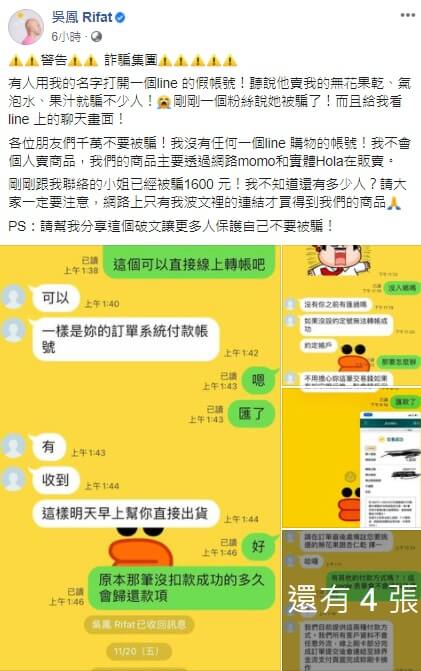 沒想到等到買家順利把錢匯到戶頭之後,冒用吳鳳名義的賣家就直接搞消失退出聊天室,讓買家非常焦急,馬上找上吳鳳本人,想要詢問這到底是不是他,吳鳳後來也在臉書強調,「各位朋友們千萬不要被騙!我沒有任何一個line購物的帳號!我不會個人賣商品,我們的商品主要透過網路momo和實體Hola在販賣!」並透露,「剛剛跟我聯絡的小姐已經被騙1600元!我不知道還有多少人?請大家一定要注意!」