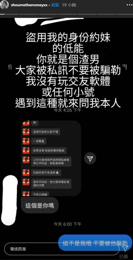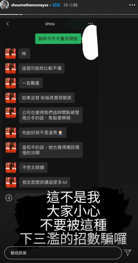 沒想到盜用名義的人馬上又說,「這你比較不懂,一言難盡,如果沒發,粉絲其實很敏感,公司也覺得我們這時間點被發現分手的話,焦點會模糊!」甚至強調說「先說好,我不是渣男,是和平的談,她也覺得應該慢慢的淡開,不然太明顯!」
