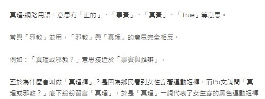 「真理」一詞在網路用語中有著「真實」、「事實」和「正的」等意思,與「邪教」相反。而回應的網友多為男性,因為這種褲子多半較短,不少男性覺得穿著真理褲的女性非常性感,故對他們而言為「真理」。