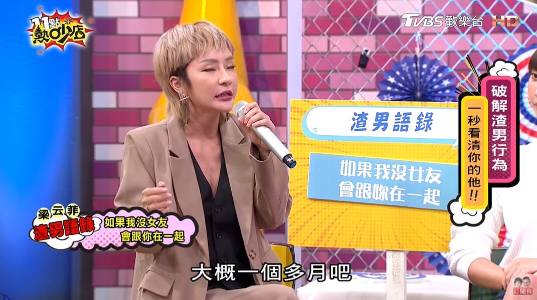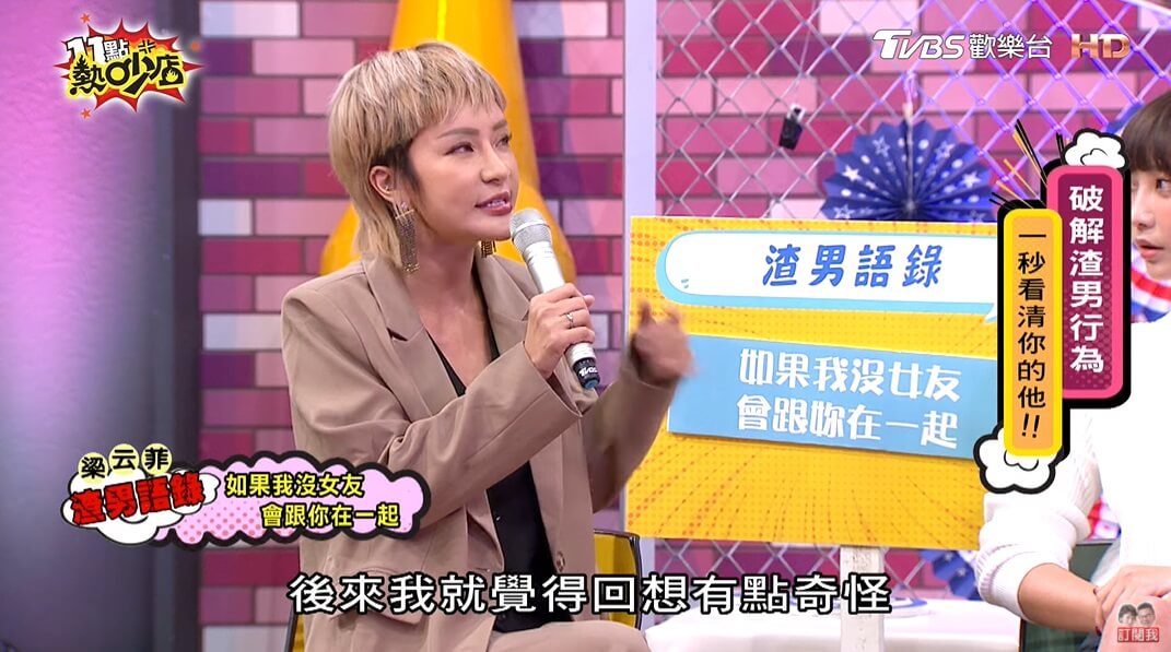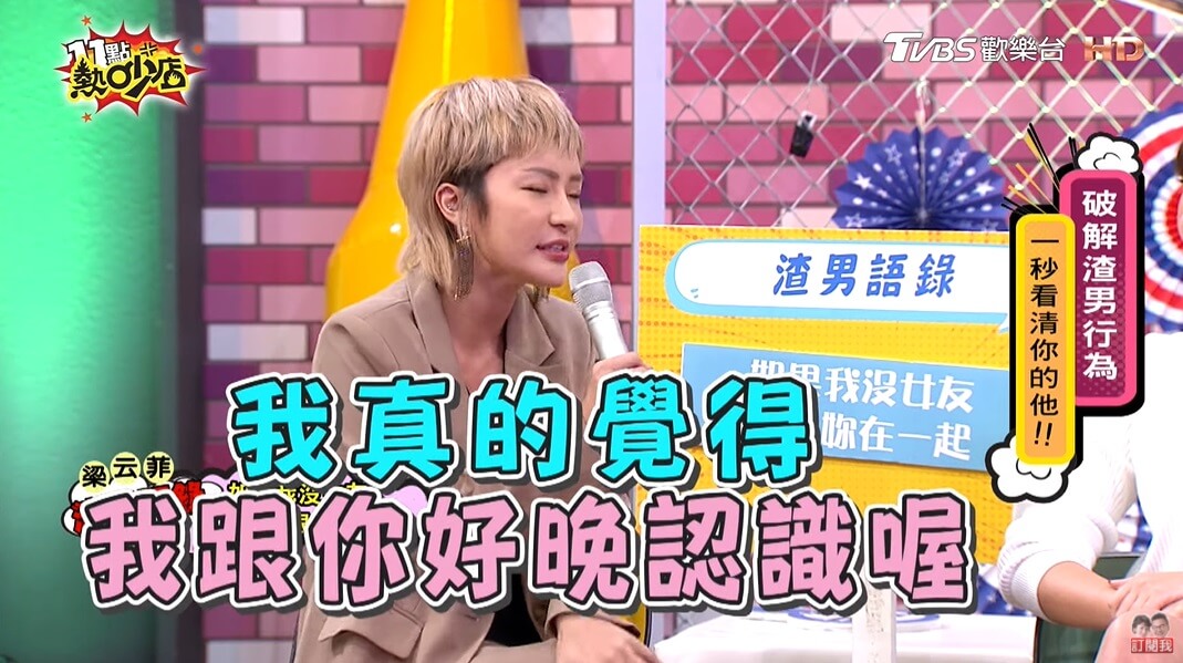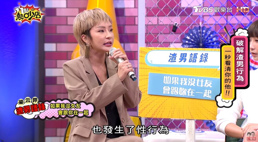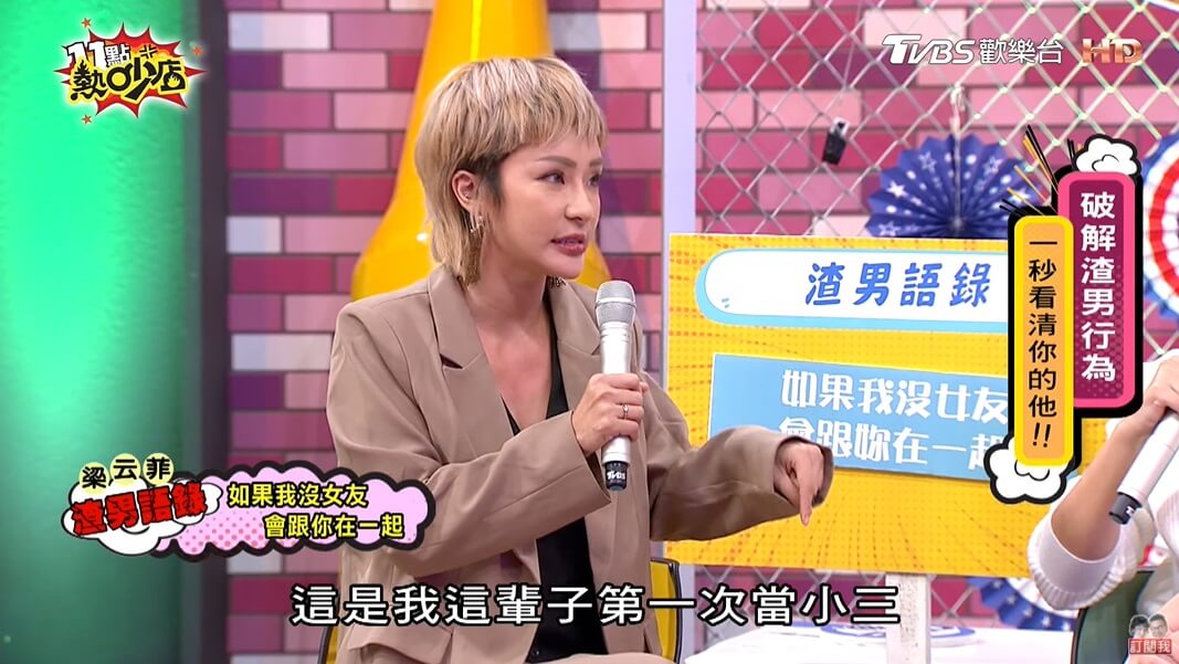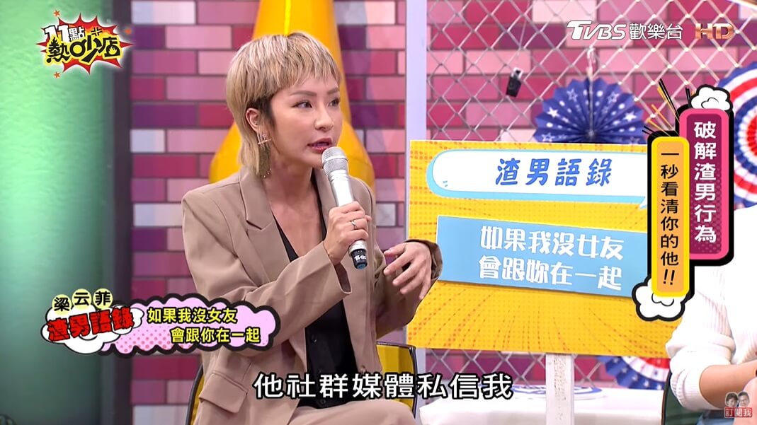 梁云菲最近上《11點熱吵店》的「甘蔗男退散!一秒破解渣男行為?!」單元,在節目中大方分享自己碰到的渣男,一開始她便提到自己碰到的人最常跟她說一句「如果我沒女友,就可以跟你在一起!」並透露,這個男生一開始透過IG私訊她,她也發現彼此有許多共同朋友,所以聊了一陣子之後決定答應對方的邀約,就一起出門吃飯。