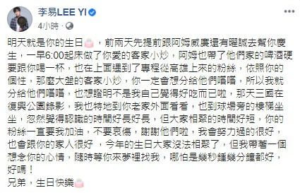 李易27日在臉書曬出了多張照片,並在貼文內容中寫道,「明天就是你的生日,前兩天先提前跟阿姆、威廉還有曜誠去幫你慶生,一早6:00起床做了你愛的客家小炒,阿姆也帶了他們家的啤酒硬要跟你喝一杯,也在上面遇到了專程從高雄上來的粉絲,依照你的個性,那麼大盤的客家小炒,你一定會想分給他們嚐嚐,所以我就分給他們嚐嚐,也想證明不是我自己覺得好吃而已啦!」