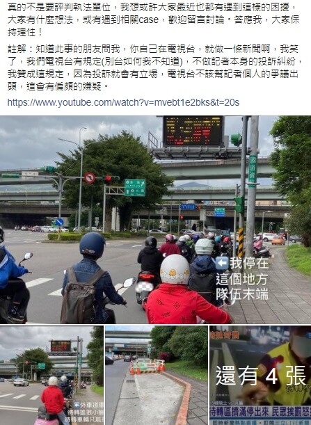 主播黃怡文最近在臉書發文曬出多張照片,並在貼文內容中寫道,「看到新聞時,我滿驚訝,我要澄清這不是我去投訴的,我也不認識該位友台記者,也就表示,不少人在這個地方,因為沒有『停進待轉區』被開單!」她也提到,「因為車流過大,待轉區只能停3至4輛機車,根本不敷待轉機車使用。上班尖峰時間,每次待轉的車輛都是超過30台以上,真的是一直排的待轉機車」。