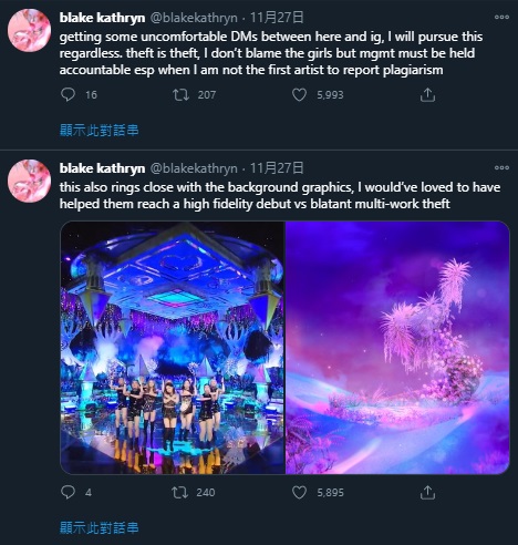 Blake Kathryn表示絕對希望有機會可以和Kpop藝人一起合作,無論是老牌還是新人都十分有幫助。她也表示十分願意幫助她們有素質地出道,而不是靠明顯地多處偷竊。雖然這讓她在推特跟IG上都收到不少讓她不舒服的私訊,但她表示仍然會把事件說出來。