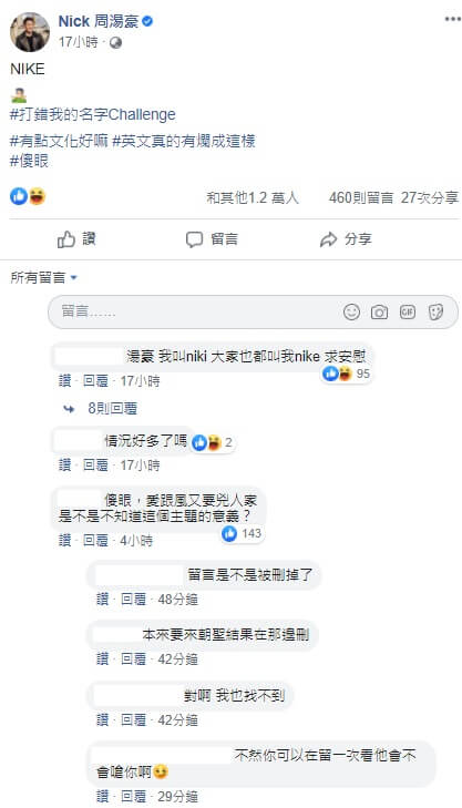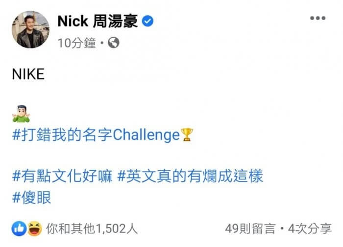 周湯豪29日在臉書發文跟風「#打錯我的名字Challenge」,他也在貼文內容中解釋,自己的英文名字「Nick」很常被叫成「NIKE」,讓他非常不解,直呼「有點文化好嗎?英文真的有爛成這樣?傻眼!」引起不少網友們的注意。