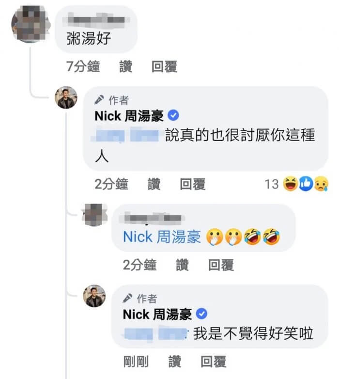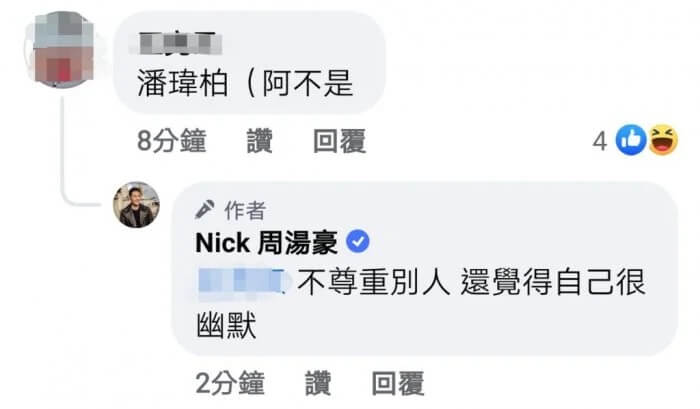後來大家也紛紛湧入他的貼文底下留言跟他互動,「我叫niki,大家也都叫我nike~求安慰!」、「該不會是...Nick × Nike, 要出聯名款嗎?」、「名字打錯真的忍無可忍」,也有不少網友直接把周湯豪的名字寫錯,「粥湯蠔」、「潘瑋柏」,結果引來周湯豪本人不滿,直接在留言中反嗆,「不尊重別人,還覺得自己很幽默」、「說真的也很討厭你這種人,我是不覺得好笑啦!」。