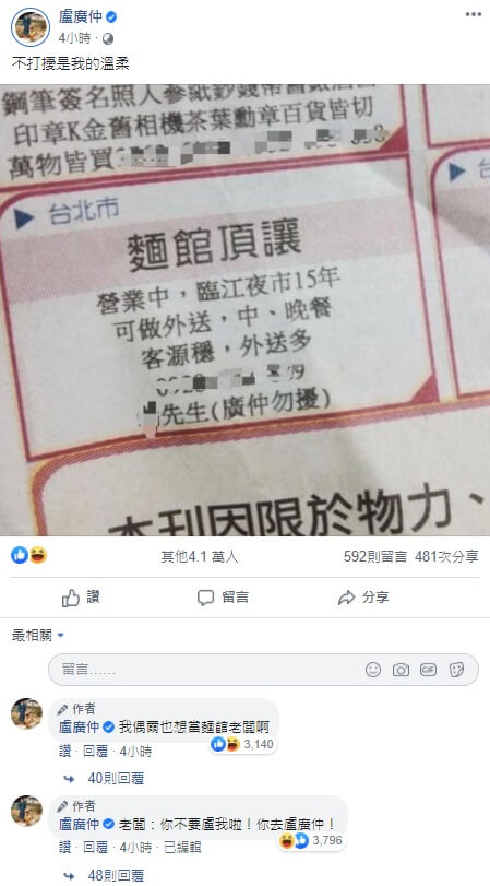 盧廣仲最近在臉書發文貼出了一張照片,並在貼文內容中寫下,「不打擾是我的溫柔」,從照片中可以看到,這是疑似報紙上的刊登廣告,可以得知在台北市有一家麵館要頂讓,詳細介紹中也可以知道,目前店家營業中,在臨江夜市15年了,可做外送,中、晚餐,客源穩定,外送多!可以聯繫某某先生,最後還強調「廣仲勿擾」!