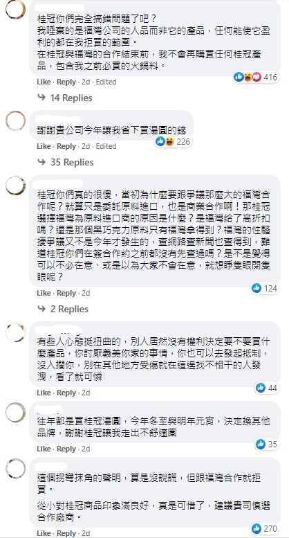 12月5日時桂冠發表聲明,表示「黑巧克力原料是委託福灣進口,並非是聯名商品」,然而網友們並不買帳,認為雙方仍有合作關係。