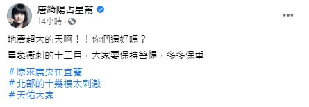 唐綺陽在10日晚上地震發生過後,在臉書發文關心所有人,「地震超大的天啊!!你們還好嗎?星象衝刺的十二月,大家要保持警惕,多多保重」還加上了Hashtag「#原來震央在宜蘭 #北部的十幾樓太刺激 #天佑大家」,希望大家可以多多注意這個月,可能還會有更多變動與大事在等著發生。