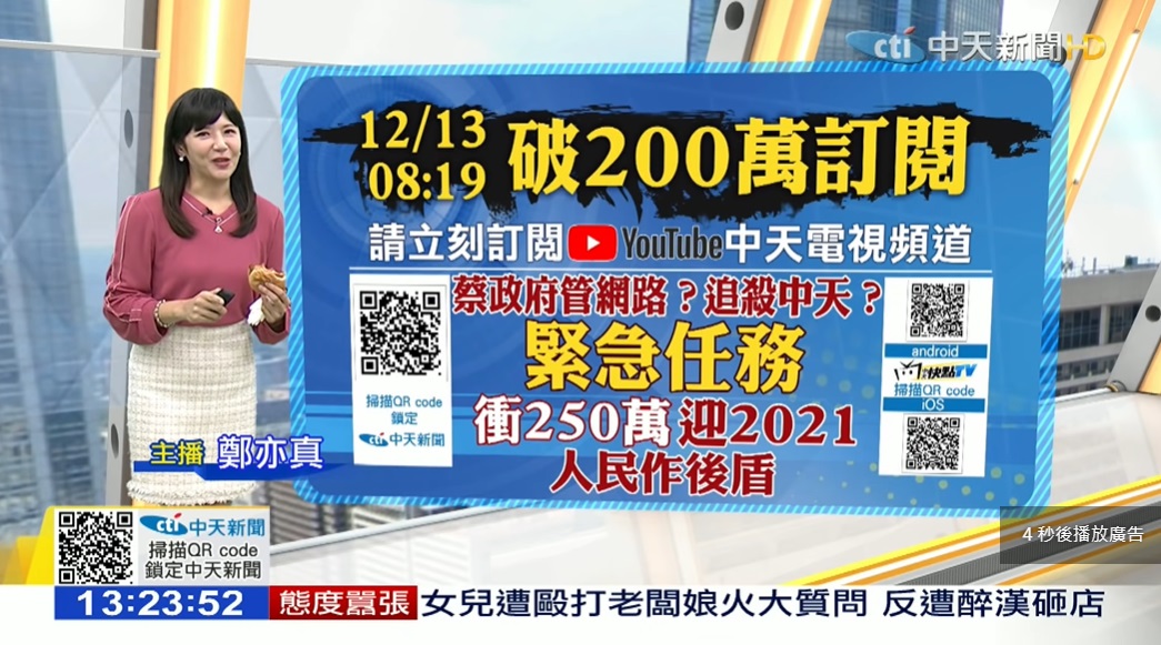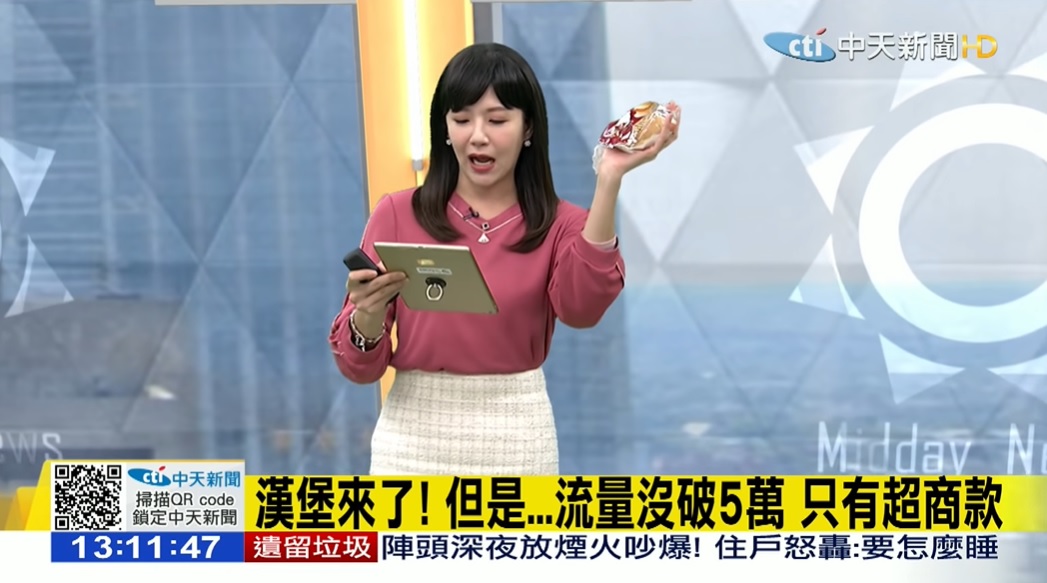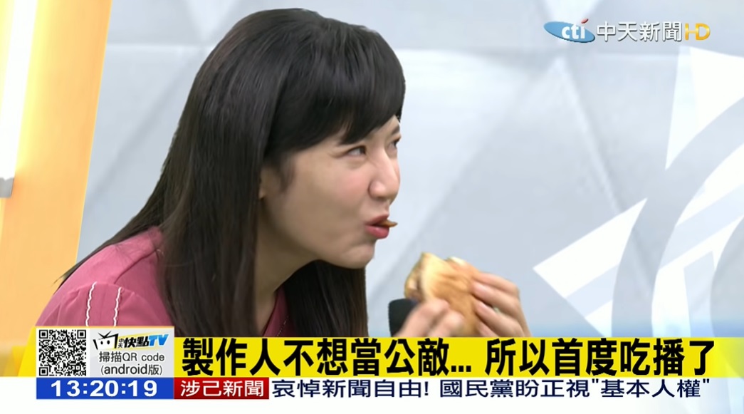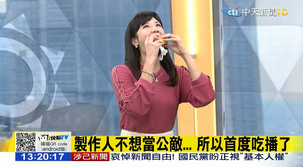 中天新聞台在12日正式關閉,而新聞製作團隊則轉往網路播報的方式來繼續跟閱聽眾們傳播新聞,像是在13日那天就有一位美女主播,以有別於過往嚴肅正經的播報方式,在鏡頭前大方的一邊吃漢堡,一邊播報新聞,還有粉絲擔心她吃了太乾不好說話,製作人馬上派人買可樂,讓主播可以跟粉絲們乾杯,相當逗趣親切!