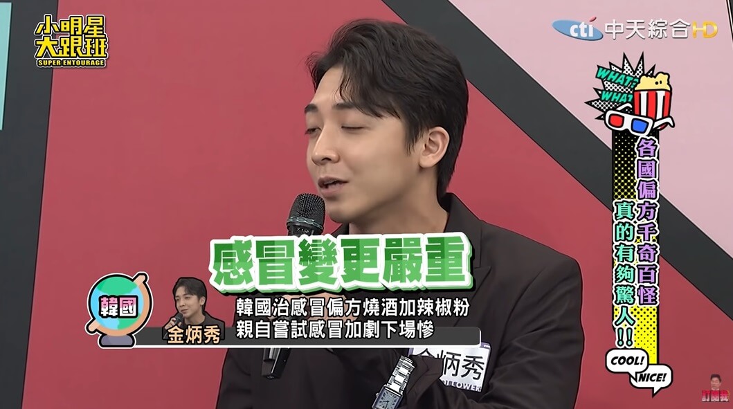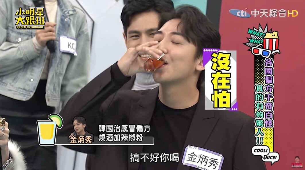 而祖雄也分享了馬來西亞的特殊偏方,他們當地人會使用「墨水」來洗眼睛,把眼睛裡面的髒汙給清乾淨,不過祖雄也有強調,「那是一種漢方,算是中藥的墨水,並不是真的是寫毛筆的那種墨水!」接著,金炳秀也分享了韓國治感冒的偏方,是拿「燒酒混辣椒粉」喝下去,結果他親自嘗試之後,讓感冒便得更嚴重,逗笑了現場所有人。