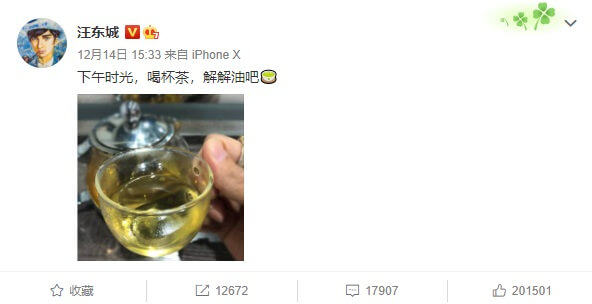 後來汪東城也在微博發文貼出一杯茶的照片,並在貼文內容中寫下,「下午時光,喝杯茶,解解油吧!」從照片中可以看到,他面前放著一壺茶,手上還拿著一小杯茶,看起來相當愜意。讓不少網友們都在猜測他是在回應表演太油的事情,認為他的回覆相當幽默,還給他鼓勵說,「你不油!你是優!聽到沒!」、「小傻蛋!不准再說自己油了!」、「熱血笨蛋汪東城!」、「你在我心目中是最棒的~」。