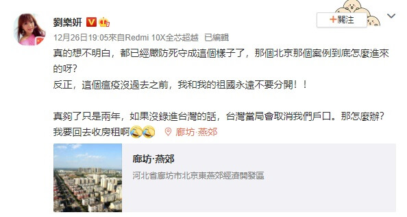 像是最近中國北京傳出又有人確診,劉樂妍也忍不住在社群平台上發文表示,「真的想不明白,都已經嚴防死守成這個樣子了,那個北京那個案例到底怎麼進來的呀?反正,這個瘟疫沒過去之前,我和我的祖國永遠不要分開!」強烈展現自己熱愛祖國的心情,不過曾透露過自己在台灣兩間房子都租出去了,自己也很擔心,「如果沒入境台灣的話,台灣當局會取消我們戶口...那怎麼辦?我要回去收房租啊!」真心害怕自己無法回來收錢。