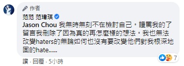 沒想到PO文一出之後,馬上掀起網友們熱烈關注跟討論,有網友在留言處寫下,「有一個留言問她口罩怎麼沒有捐中國真的是超好笑的」,吸引了許多網友湧入底下留言,讓范瑋琪看了非常無奈的說,「我無時無刻不在檢討自己!謾罵我的了留言我刪除了...因為真的再怎麼樣的想法,我也無法改變haters的,無論如何也沒有要改變他們對我根深地固的hate......」。