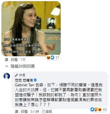 後來還有網友貼出范范先前受訪時,談到哈佛事情的截圖,讓范瑋琪直呼,「包容、放下、傾聽不同的聲音,這是我人生的大功課,但,也請不要再斷章取義硬要把我塑造成騙子!我該說的都說了,為何一直放這照片,故意讓我無論怎麼解釋都要貼這個莫須有的罪名在我身上?居心???」非常不滿網友這樣的行為。