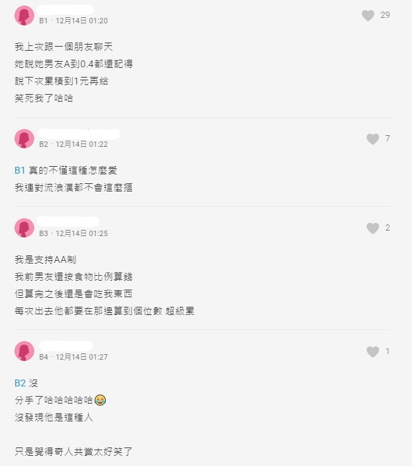 不少女性都是願意各付各的,但男方若一直「討債」或計較誰要多付1塊很容易讓女方觀感不佳。立場對調也一樣,若是女方一直「提醒」男方「你還沒給我20塊」,相信不少人也會心想「又不是不會給」。