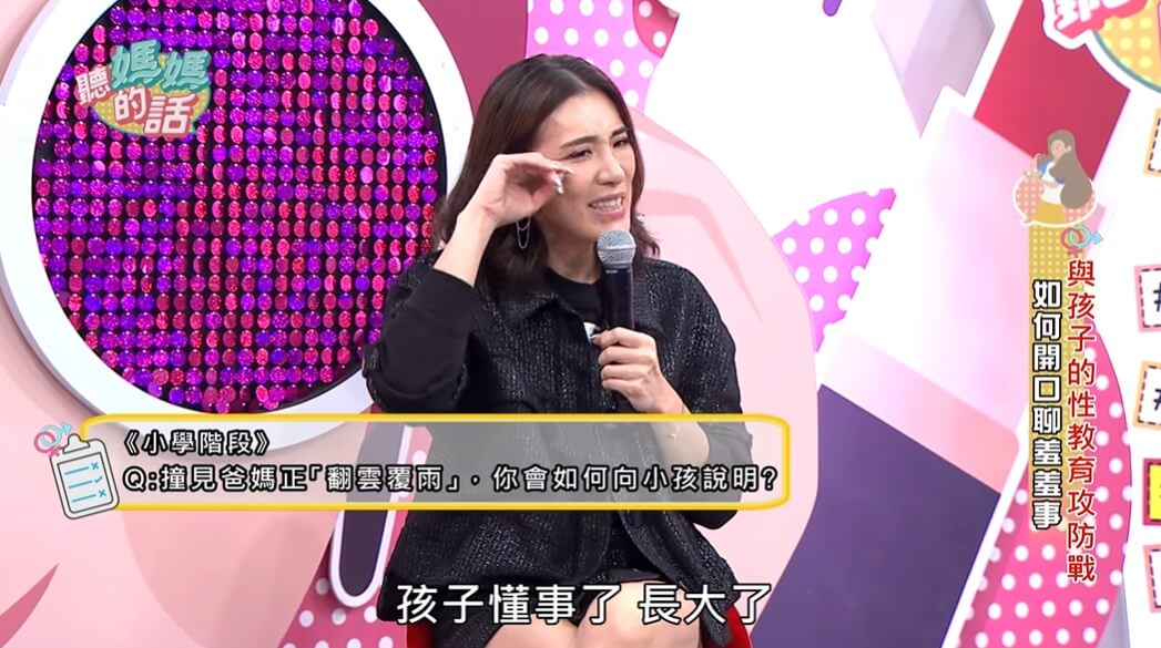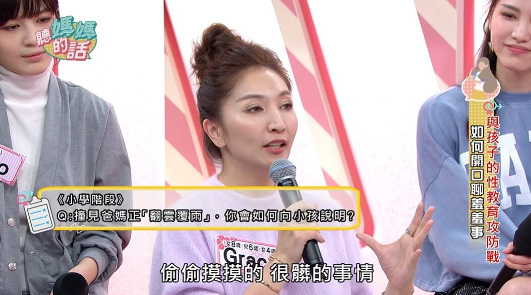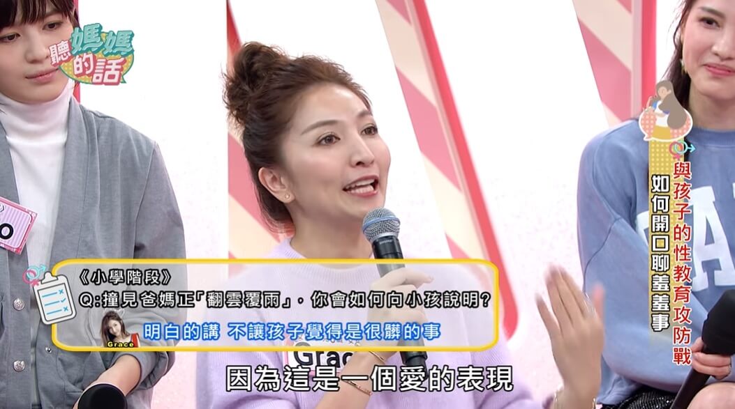 此外,節目主持人也問了來賓「若夫妻正在翻雲覆雨時,被孩子撞見該怎麼解釋?」Grace則馬上表示,我有看過一本書,是在教導大家在行房時,不要偷偷摸摸的,也不要認為那是一件「很髒的事情」!並接著指出,如果不小心被孩子撞見,就趁機教育孩子「這是爸爸媽媽專有的時間」,讓孩子們知道這時候不要打擾他們,也是一種愛的表現!此話一出,來賓們聽了都很認同。
