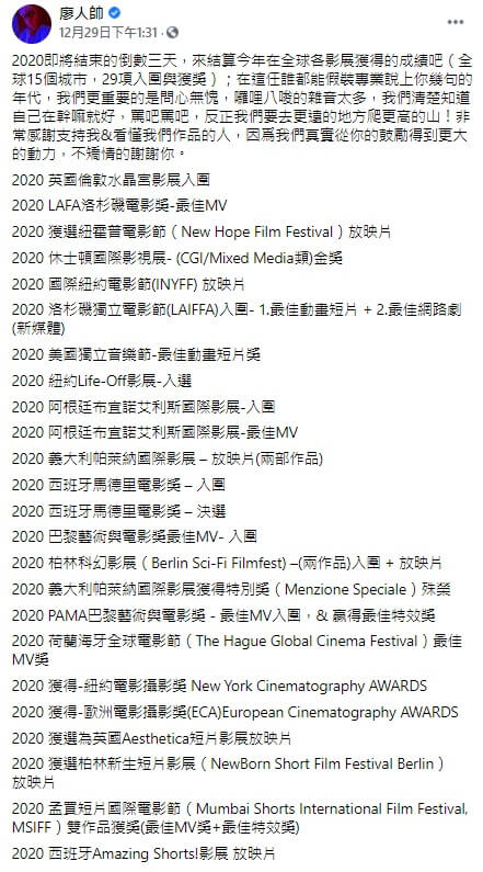 廖人帥先前因拍攝蔡依林《甜秘密》MV,掀起了相當高度的討論,也被不少酸民在網路上批評,不過廖人帥這一次決定不再多說什麼,而是選擇在2020即將結束這幾天,在社群平台上跟大家分享自己這一年來的戰績,他結算2020在全球15個城市中,參與過各種影展,總共榮獲29項入圍與獎項!