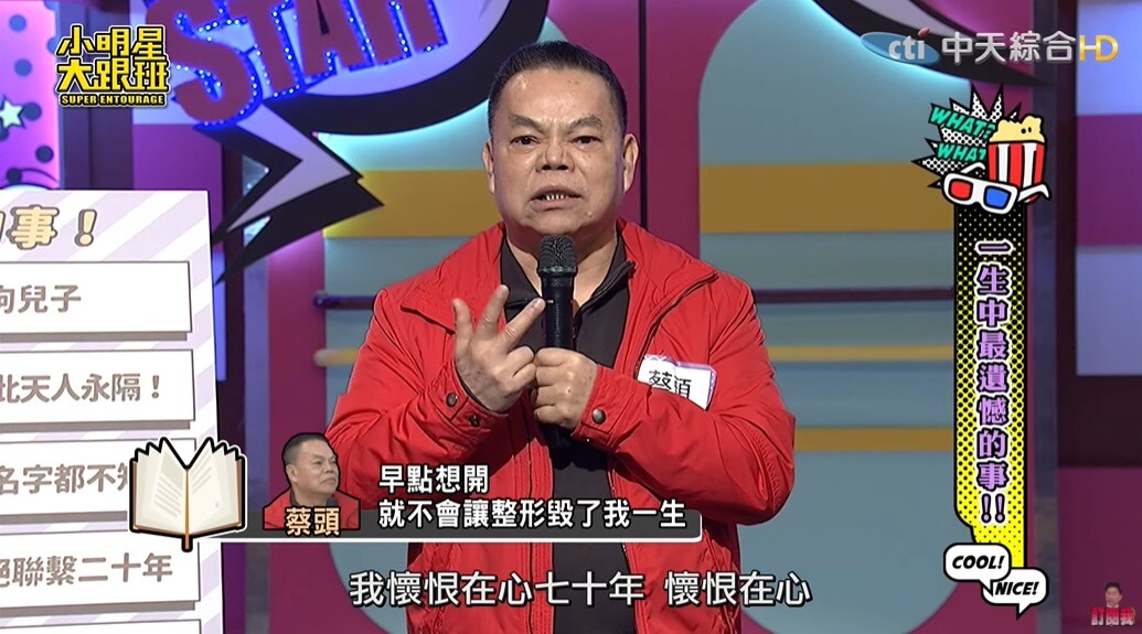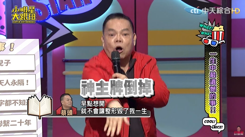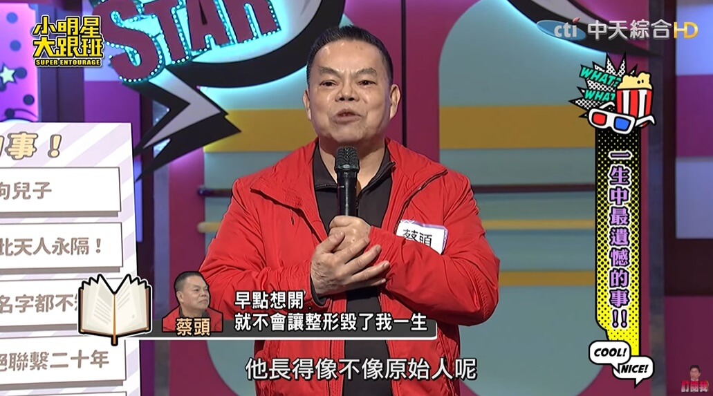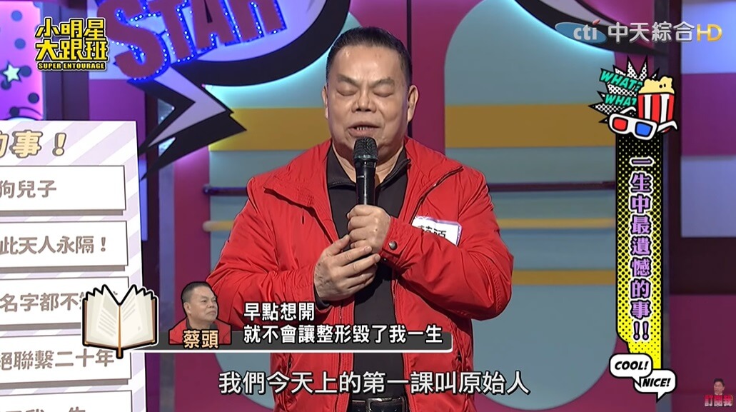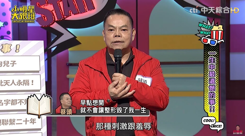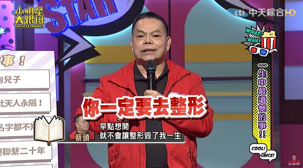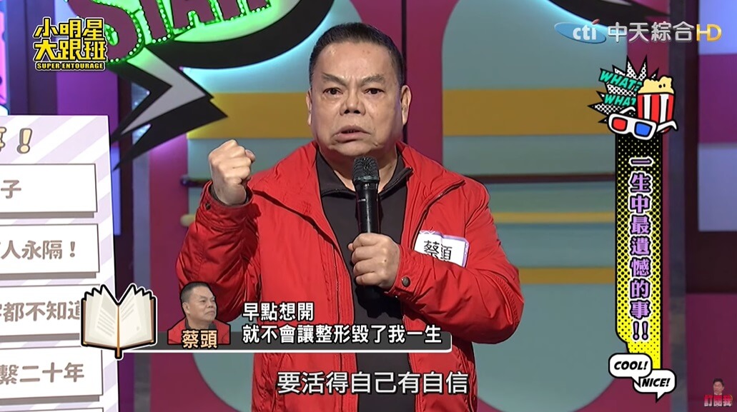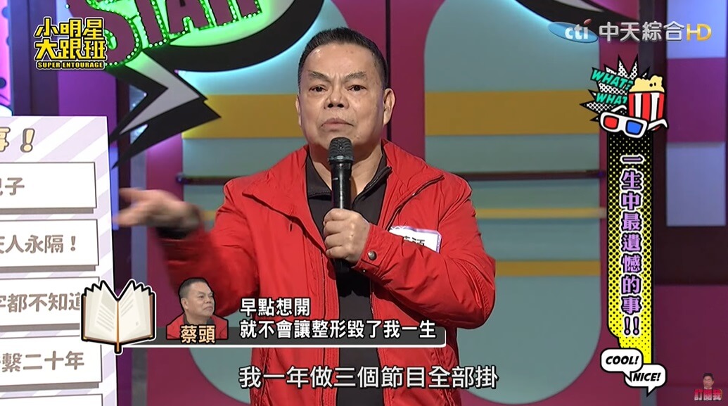 藝人蔡頭(蔡斯文)曾是秀場天王級藝人,憑著浮誇的說話表現與獨特的幽默感,讓他成了各大綜藝節目的常客,大家都喜歡看他做的效果,也擄獲了不少觀眾們的喜愛!不過他最近上《小明星大跟班》節目時,提到自己在人生中有幾件相當遺憾又後悔的事,其中「整形」一事,引起了網友們熱烈關注與討論!