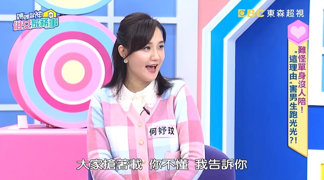 何妤玟最近上《媽媽好神之俗女家務事》節目,大方聊到自己的感情事,她提到自己對感情的要求很多,還忍不住說到前一段婚姻,「受傷有多大,改變就有多大!」認為自己在跌倒之後,已經有重新再站起來,也做出了許多改變,甚至還透露,「年輕時有很多追求者,大家都主動說要當她的司機兼工具人!」讓在場來賓聽了都非常驚訝。
