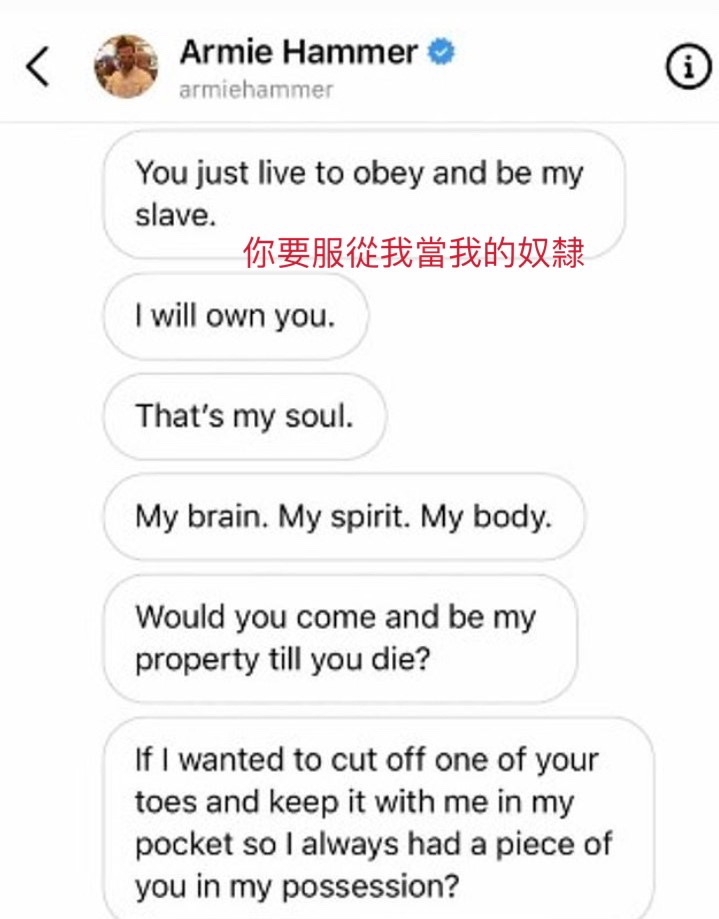英國《每日郵報》報導,現年34歲的美國男星艾米漢默日前遭多名「情婦」爆料,傳送變態內容訊息給她們,包括指自己有特殊SM癖好,傳送「想吃人肉」、「吸人血」、「打斷骨頭」甚至要求這些女子當性奴。而眼尖的網友也發現,艾米漢默在INSTAGRAM追蹤了多個「敏感詞語標籤」,像是「#knifeskills」(刀工)、「#shibari」(日式BDSM繩縛)等,意味著關於這類型的照片、影片都會出現在他的IG資訊中。