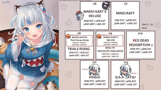 知名VTuber「Gawr Gura」人稱鯊鯊,人物設定是來到陸地上的亞特蘭蒂斯後裔,歲數已經超過9000歲,並且主攻英語市場,專長是唱歌、音遊。她在第一次開設直播時遲到15分鐘,而且只留下一個「A」就關台,這個A也被粉絲製成迷因梗,在網路上瘋狂流傳。