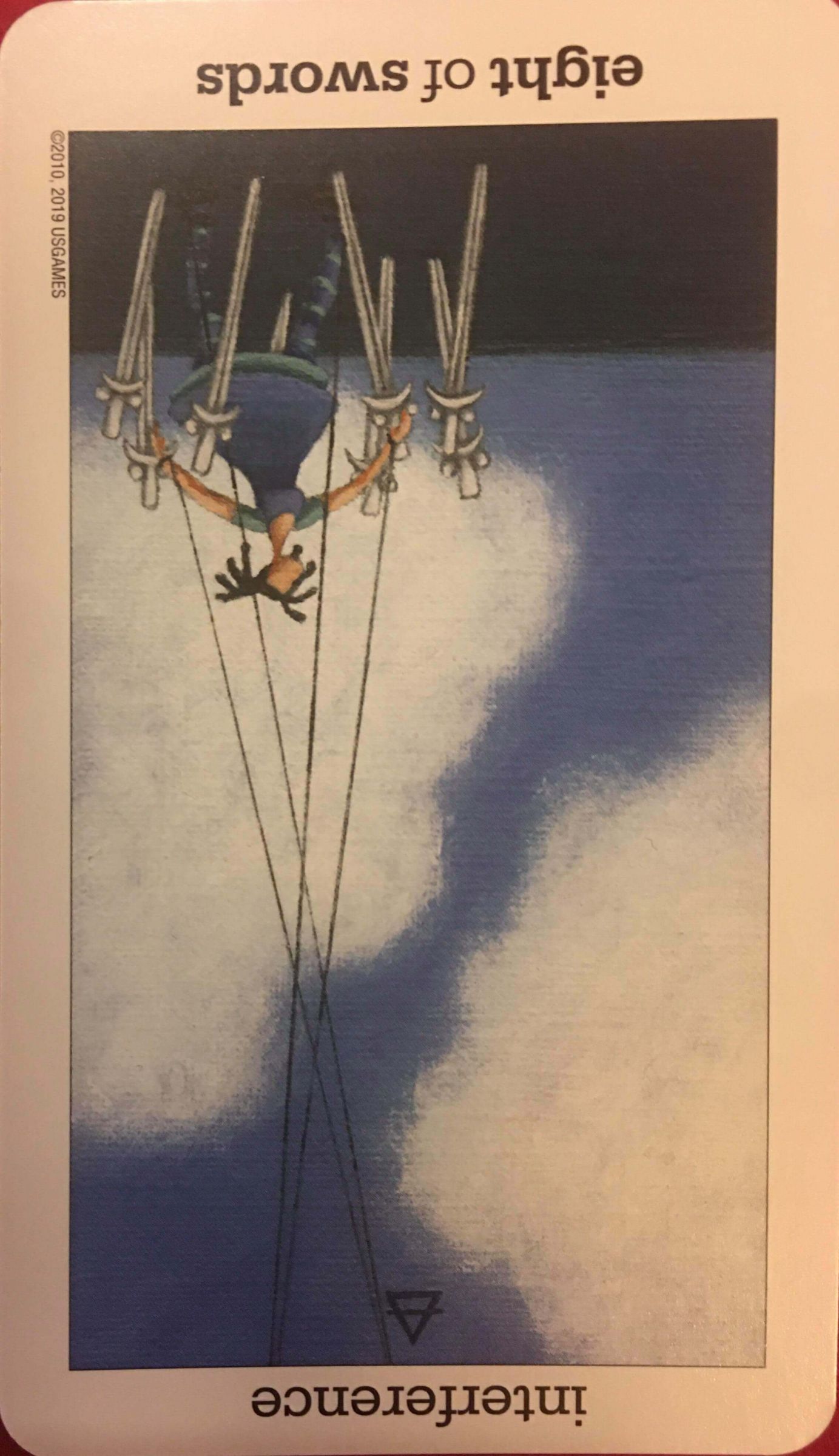牌面中的女性身邊圍繞著八把劍,象徵你身旁的限制;空中有四條線,分別束縛住這個女生的雙手雙腳,代表行動受限,也有一種宛若懸絲魁儡的感覺,暗示你對目前的處境感到身不由己,無奈又無力。事實上,目前的可能性比你所能理解得更多,也帶來許多選擇,危機就是轉機,且戰且走才能前進喔!