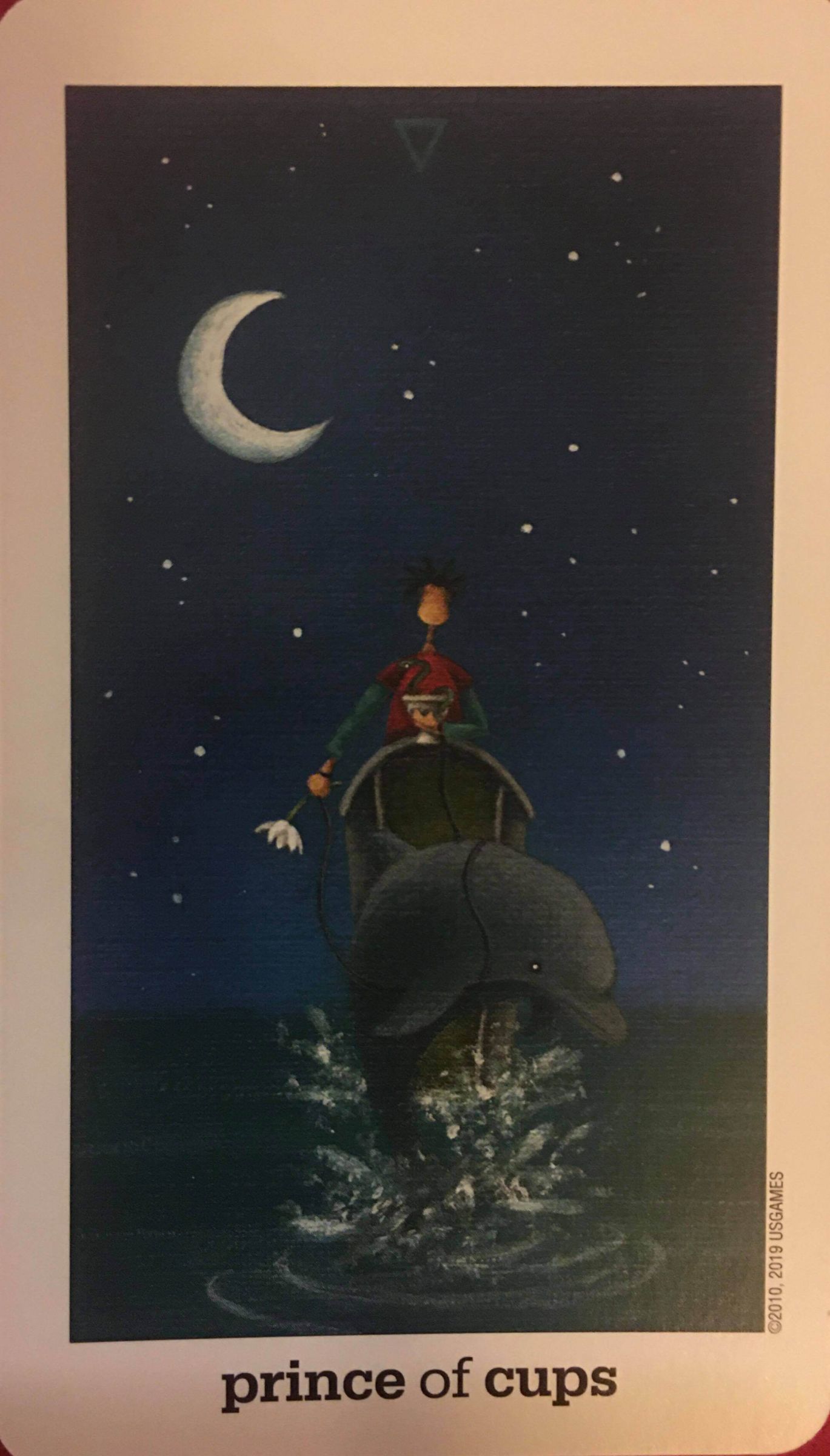 牌面上的王子一手舉著聖杯,聖杯中還有一條青蛇,代表此時情緒上的轉變,另一手拿著花,則代表他纖細豐富的情感,而海豚則代表追求自由的精神,這種又期待又怕受傷害的心情,跟海上的一輪彎月相互輝映。環境的變化我們無法掌控,在未來混沌不明之時,只要把握當下,過好每一天就是贏家。