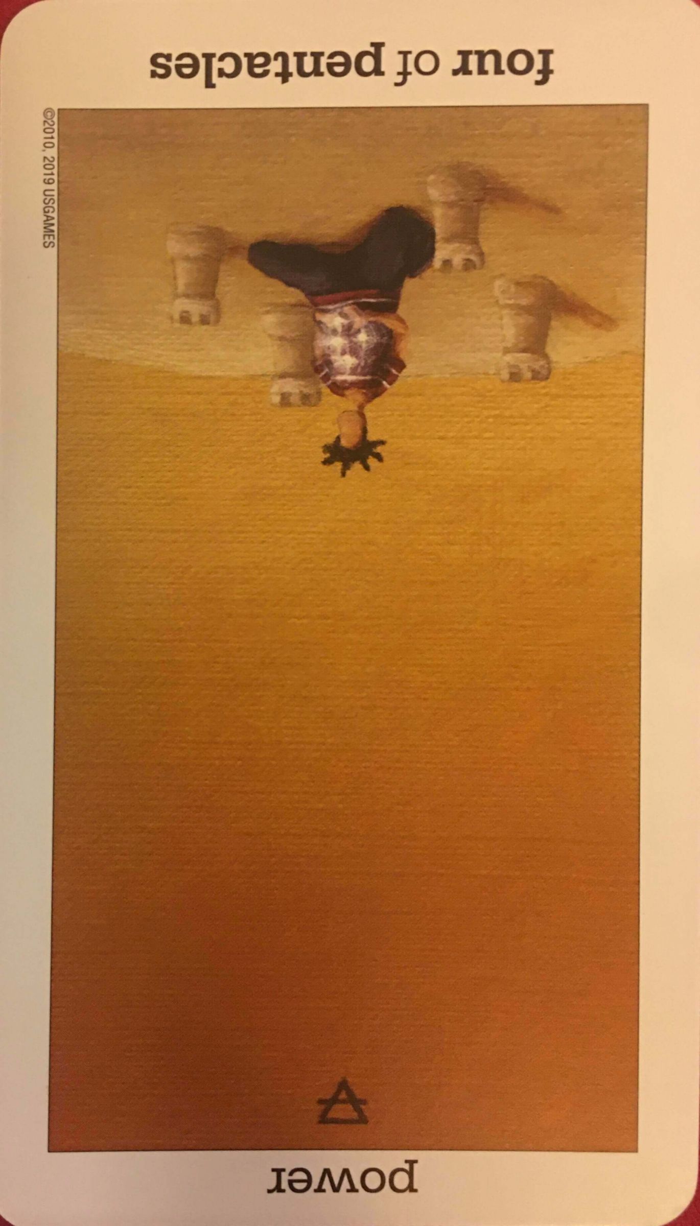 牌面上的男性跪坐在沙丘上,手上捧著的光球象徵他的力量,旁邊四座沙堡代表邊界與界限,也是他的領土範圍,當牌卡逆位時,暗示你在這段時期比較有無力感,安全感受到挑戰,然而水逆同時也在幫助你學習彈性因應混亂,就算事情無法控制,我們仍能專注在實際而具體的行動,重新建構穩定生活。
