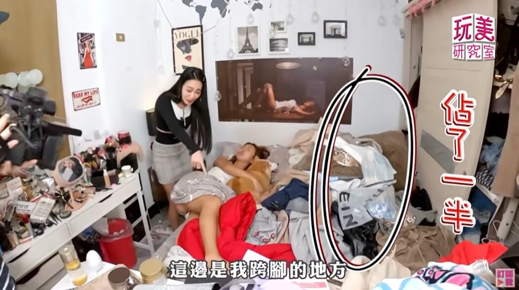 王思佳最近參與《女人我最大》的節目企劃《玩美研究室》,特別到薔薔家中要來拯救她的閨房,沒想到當她一進到薔薔家,馬上看到薔薔床上堆了滿坑滿谷的衣服,而她則是只能躺在床角,抱著柴犬栗子,屁股整個騰空,看起來相當克難,讓王思佳看了傻眼到不行!