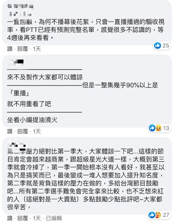 而目前粉專上公布新選手的貼文也有超過300個「生氣」的心情數,不少網友在貼文下留言:「從期待到失望」、「再繼續這樣播,真的母湯哦!要回顧網路上都有很多影片可以看」,不過蔡尚樺也為節目組緩頰,表示第二季為了更進步,花了很多時間在海選,「其實這是一個冒著被罵的風險也要勇敢做的決定,這樣的本意初衷希望你們都能懂」,希望觀眾能對節目組多多諒解。