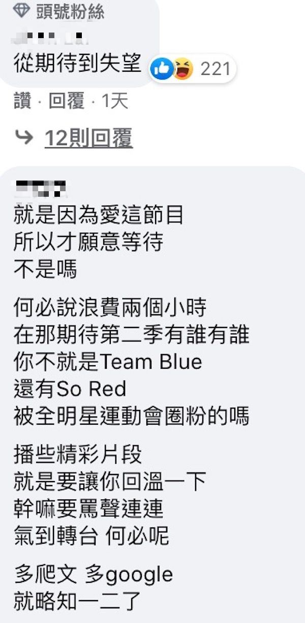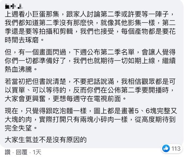 事實上也有不少網友力挺節目組,認為做4集回顧單元緩衝,給第二季更多準備時間沒什麼不好,並表示:「就是因為愛這節目所以才願意等待,不是嗎」,也有網友理性寫下長文分析生氣原因,透露大家對第二季真的非常期待,也不是不願意等待,但節目組給予觀眾太多期待,卻沒有公布完整名單,才會導致觀眾期望落空。