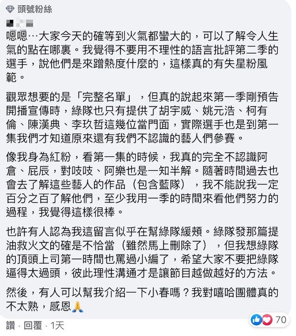 不過文末卻寫到:「至於一直謾罵狂酸的網路朋友,等一下就跟這個粉專說拜拜吧」此貼文發布後引起網友們強烈不滿,也有網友憤怒表示自己只是留言說「敲碗更多場外花絮」,就遭到粉專封鎖、刪留言,讓該網友難過表示「像被澆了一桶冷水」,這篇貼文在發布後不久也被刪除。