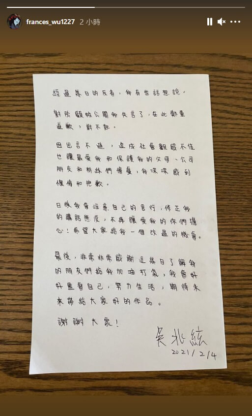 如今,吳兆絃也在事發過後幾天,在社群平台上貼出手寫信,鄭重的道歉,「經過幾日的反省,我有些話想說,對於顧姓公關我失言了,在此鄭重道歉,對不起!因出言不遜,造成社會觀感不佳,也讓最愛我和保護我的父母、公司、朋友和粉絲們擔憂,我深深感到懊悔和抱歉!」