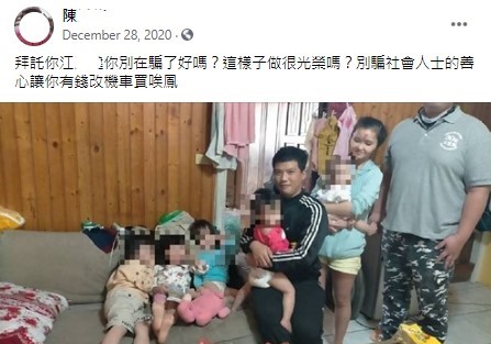 2020年12月24日江男在臉書社團發文賣嬰兒推車,表示家中小孩發燒,但沒錢帶他去看。此文引來許多善心民眾,也讓許多網友質疑是詐騙。事後台中行善團出面證實,表示江男一家經濟狀況確實不理想,讓不少網友紛紛道歉。此事也因此鬧大,許多善心人士也紛紛捐款想幫助這一家人度過難關,江男總共收到約4萬的捐款。