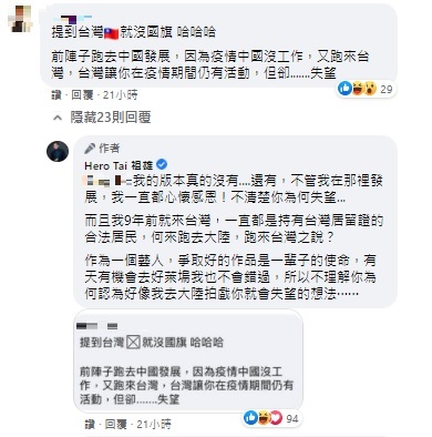 不過,在祖雄表示100年前他爺爺的戴家6兄弟在這些年來的開枝散葉遍布福州、廈門、台灣,甚至柬埔寨、越南、馬來西亞等地,兒孫一共將近600餘人的時候,他在其他國家都有加國旗,但台灣則沒有。故此有網友留言質疑:「提到台灣就沒國旗,前陣子跑去中國發展,因為疫情中國沒工作,又跑來台灣,台灣讓你在疫情期間仍有活動,但卻.......失望」。