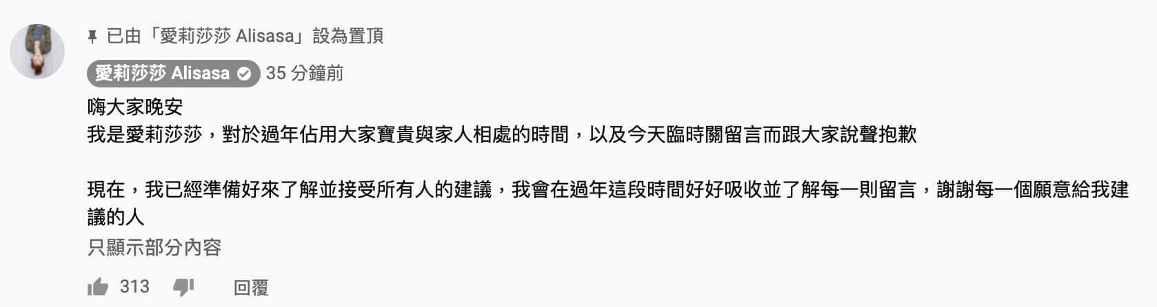 看更多:愛莉莎莎道歉了!不下架影片「重啟留言區」吸收建議 網:腦袋都橄欖油?