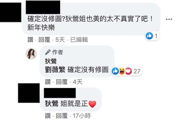 超優秀的真實身材曝光後,網友也紛紛留言:「姐姐好美」、「本人更美,身材讓人羨慕」、「好逆齡的照片」,也有網友驚訝詢問:「確定沒修圖?狄鶯姐也美得太不真實了吧!」狄鶯則親自回覆:「確定沒有修圖」,讓網友讚嘆「姐就是正!」